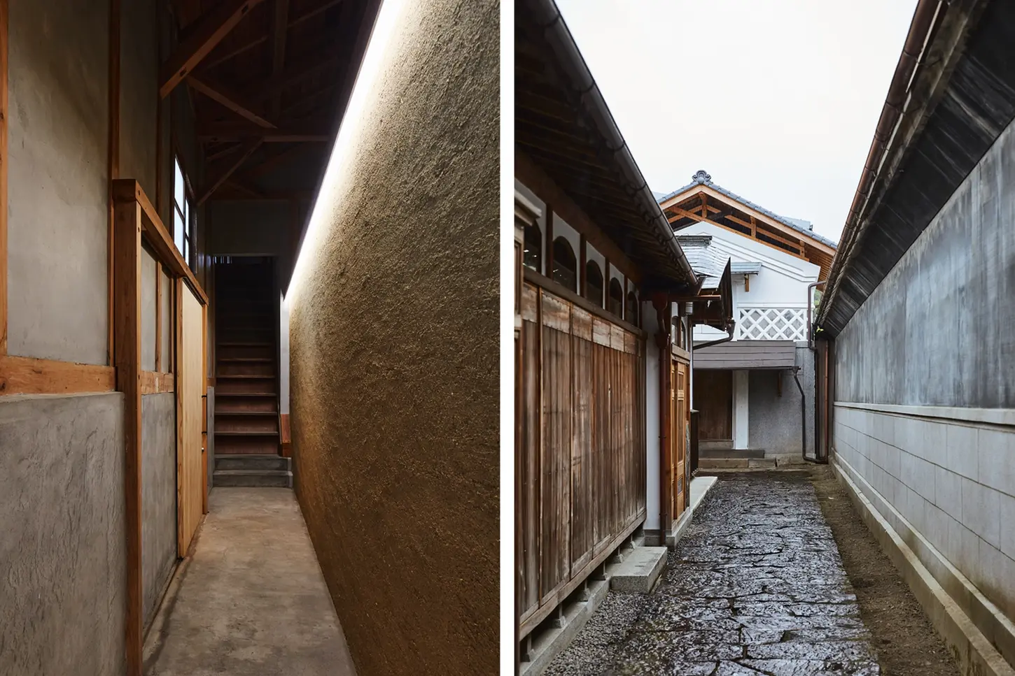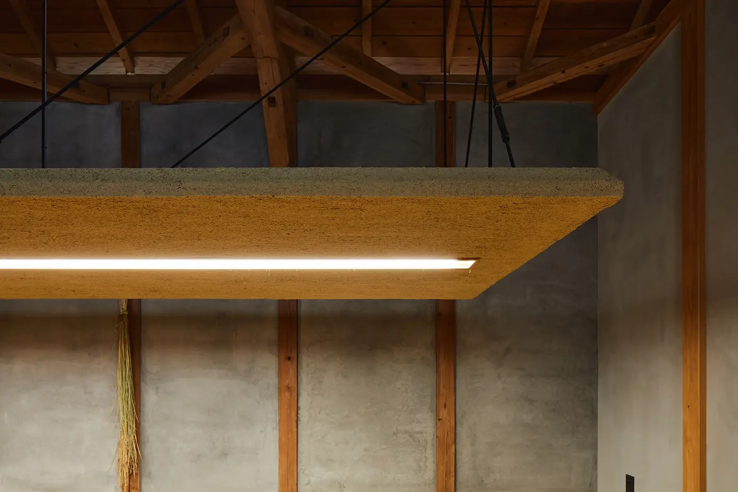 間仕切り壁と天井には藁を混ぜた土を用い、カウンターには目の細かい土を含む左官を施した。乾いた粒子が不均質に広がる表情は、光を鈍く吸い込み、蔵が蓄積してきた空気感と共鳴する。