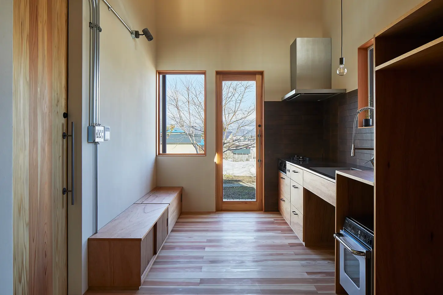 例えば、この家には玄関がない。あるのは「玄関のようなスペース」。外部から室内へアプローチするドアを入ると、ダイレクトにキッチンへつながる。これは、単一の機能が点在する従来の住宅の様式から外れ、兼ね合わせから生じる空間の自由度を拡張する試みの一つである。