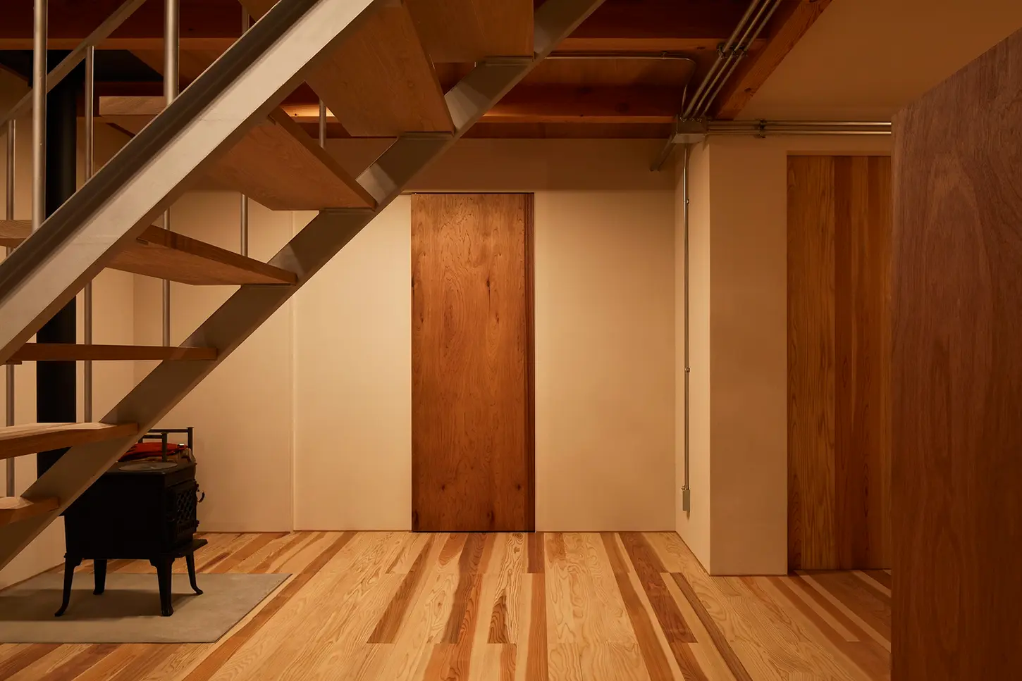 新築住宅において、通常は壁内に隠蔽される電気配線を、鋼管を用いて露出させ、エネルギーの流れを日常の視界に置き直した。